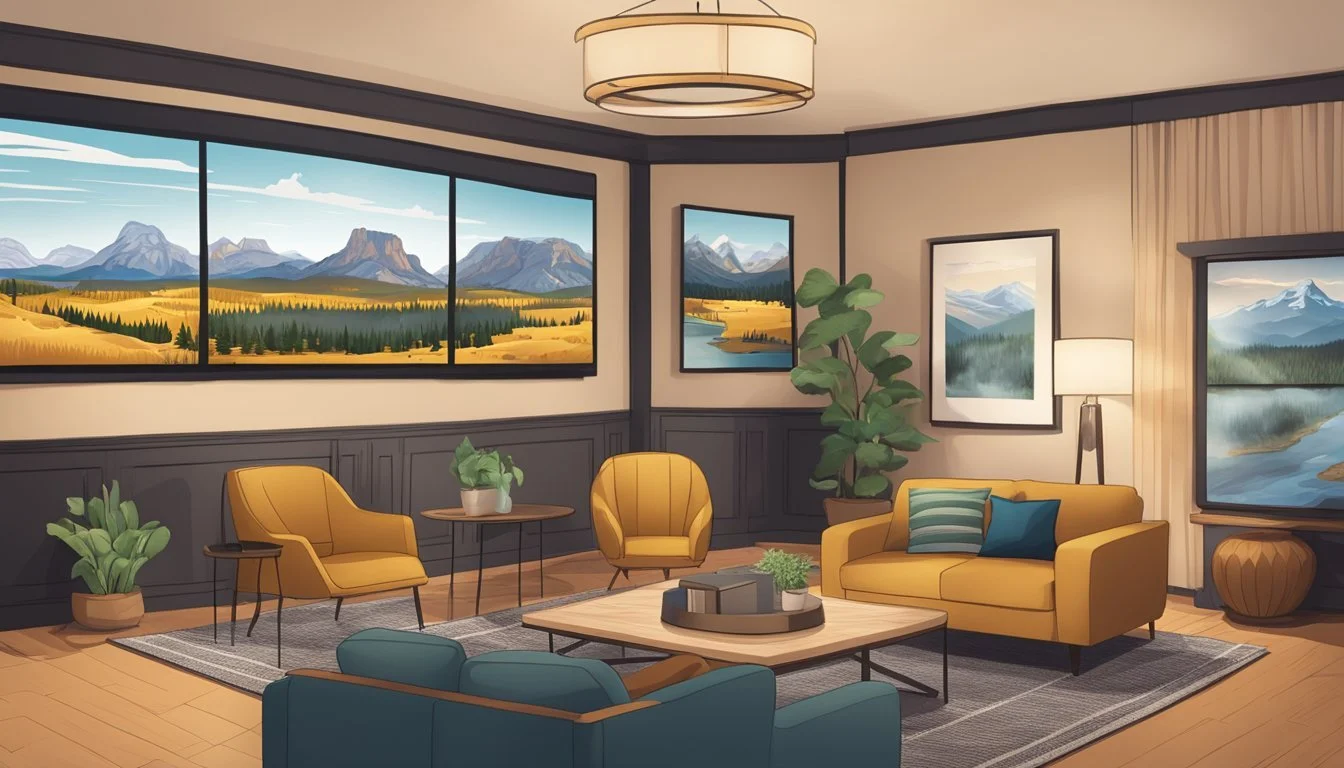 Beth Dutton's office lounge is a striking space that combines modern elegance with rustic charm. The room features large windows that offer panoramic views of the sprawling Montana landscape.