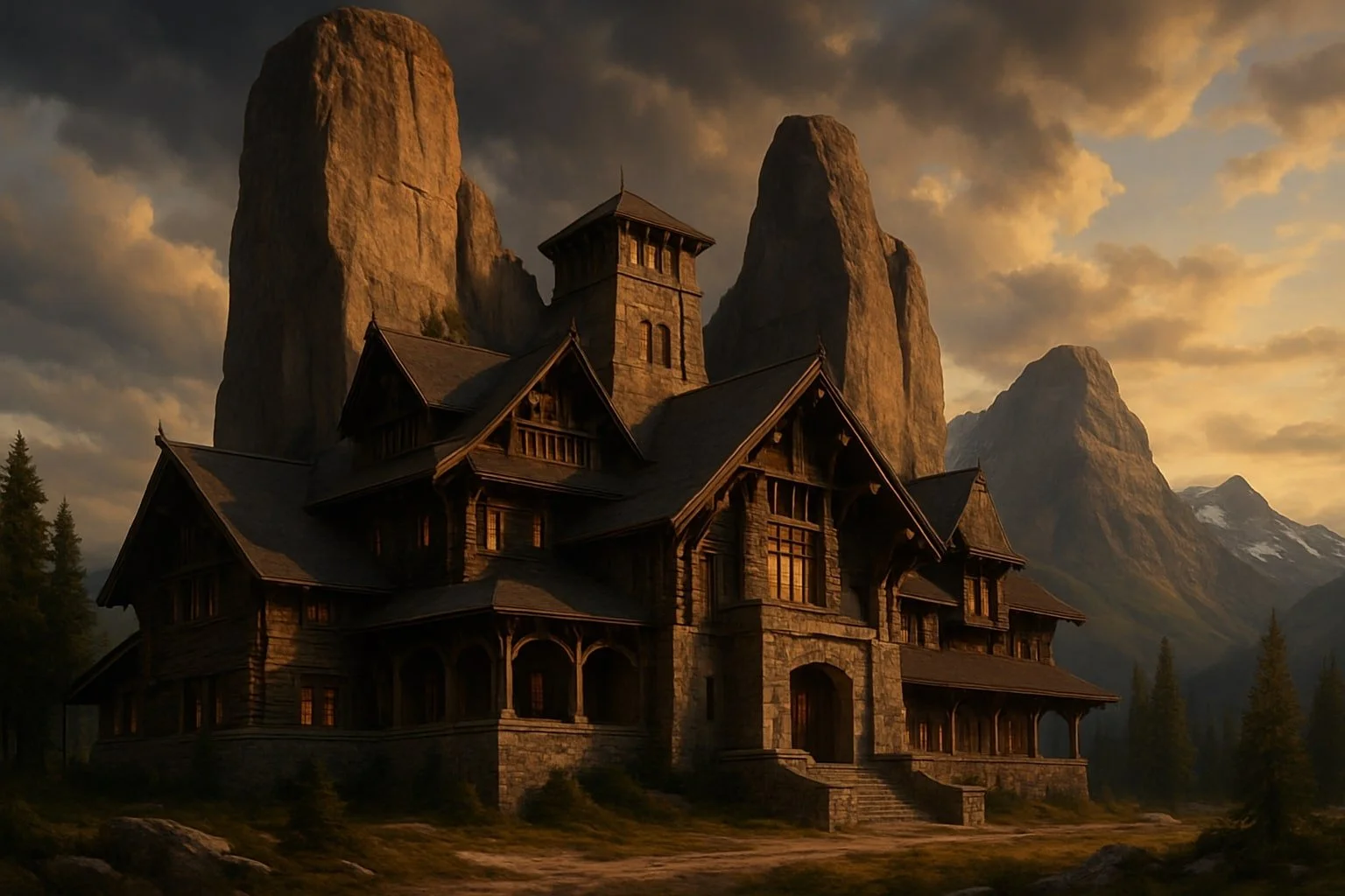 Broad stone fireplaces.